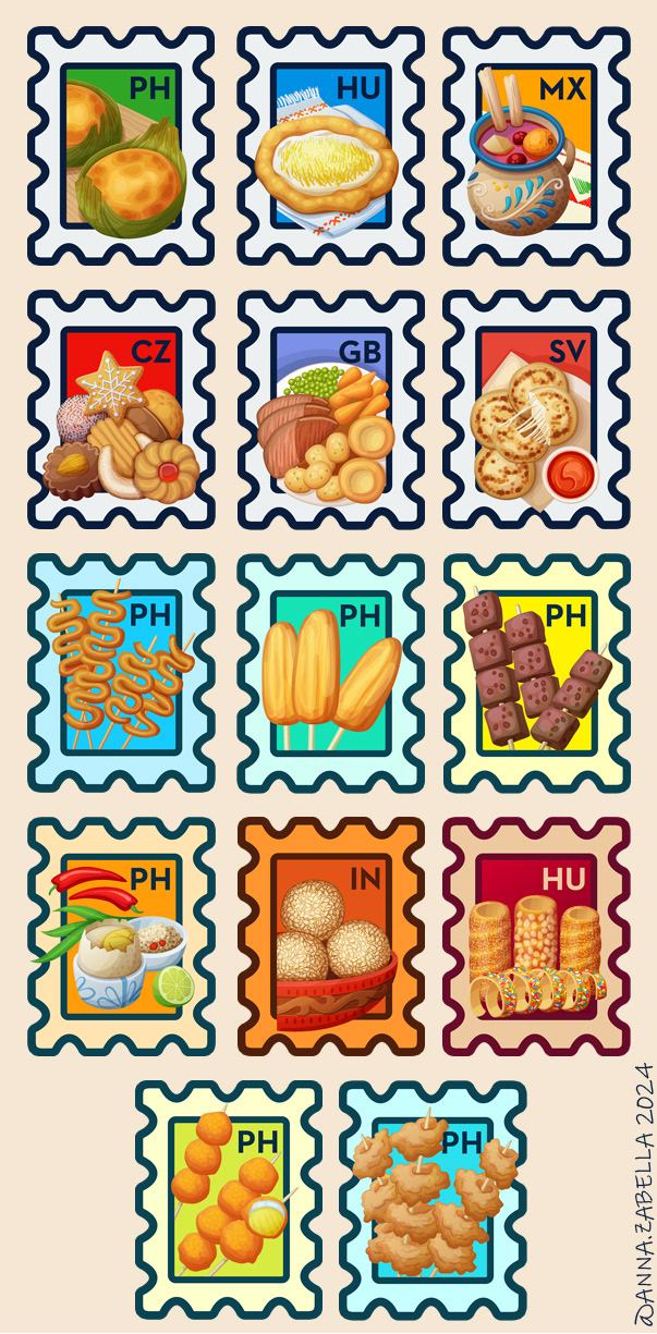 This series of illustrated stamps was created for the Slowly app, a platform where people connect through thoughtful, long-form letters—just like traditional pen pals. Each stamp represents a delicious dish or snack from different countries, celebrating global culinary diversity. From bibingka (Philippines) to chimney cake (Hungary) and atole (Mexico), these vibrant illustrations capture the essence of local street food, festive treats, and beloved comfort foods.